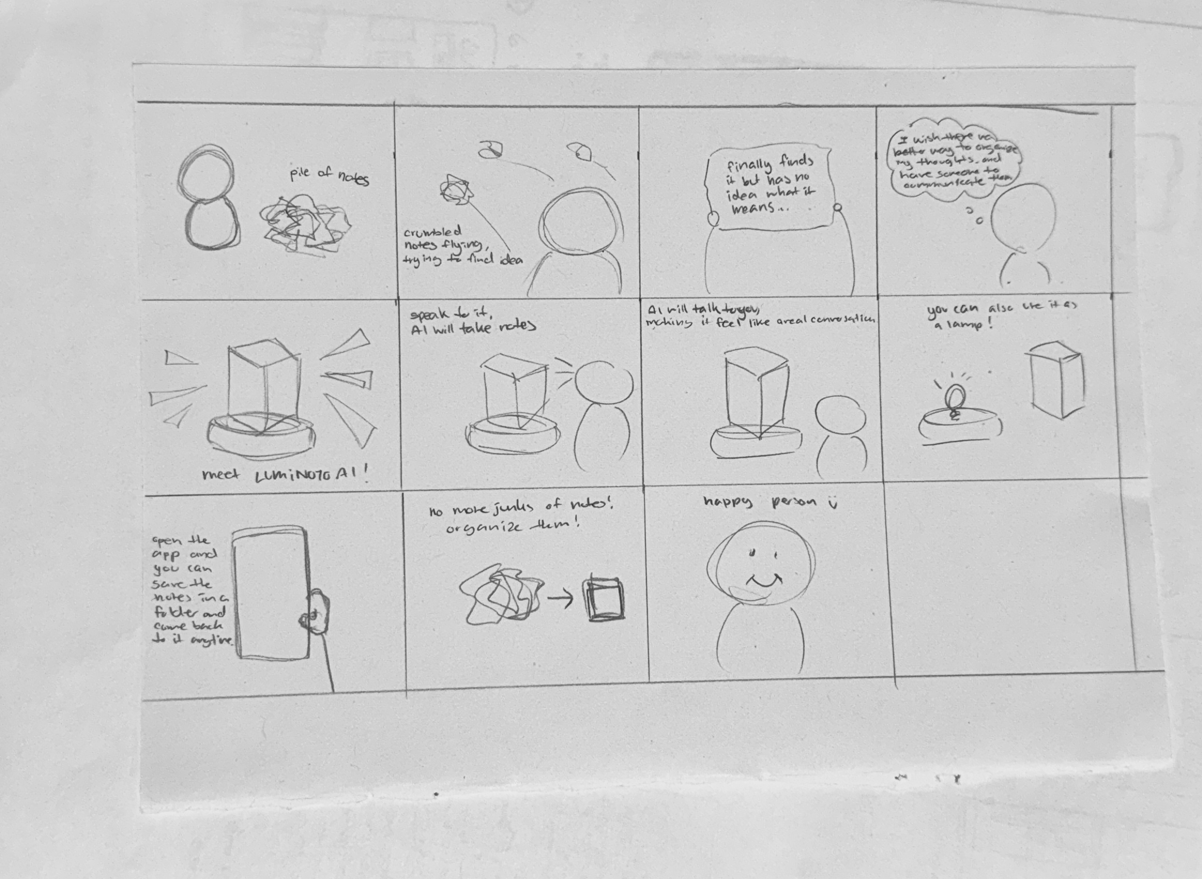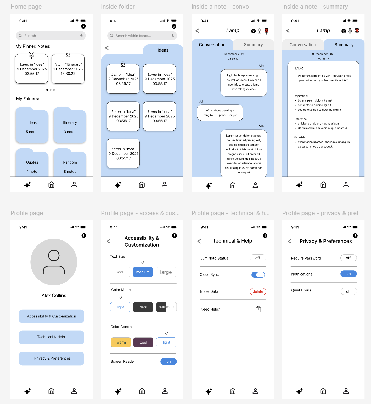 I owned the full design process from initial concept, user research, to initial prototype. I began with research into how people capture, organize, and revisit notes across physical and digital mediums, then translated those findings into explicit user journeys, task flows, and interaction patterns that reduced friction while increasing effectiveness. Throughout, I treated human-computer interaction principles as the backbone of the work—carefully designing feedback, affordances, and information hierarchy so that LumiNoto feels intuitive on first use yet powerful over time.